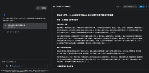プロンプト(AIに出す命令文)を書いて文章の下書きをしてもらい中身を修正するだけで資料を作成します。一から作成しているとかなり大変だし建設業界の技術的に難しいレポートなどの作成も「Deepリサーチ」で文句なしの内容で作ってくれます。例えば建設業では絶対に必要な「施工計画書」などもお手の物です。(内容はしっかりと正確であるか確認する必要はありますよ。)