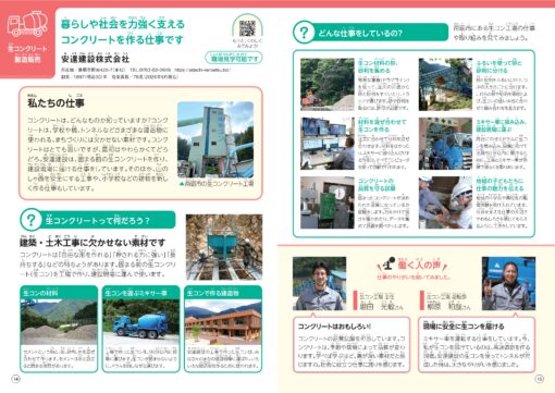 冊子では、生コンクリートがどのようにつくられ、どんな場所で使われているのかを写真とともに分かりやすく紹介。南砺市にある当社の生コン工場や、実際に働く社員の声も取り上げていただき、子どもたちが地域の仕事を身近に感じられる内容になっています。