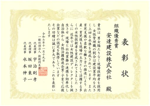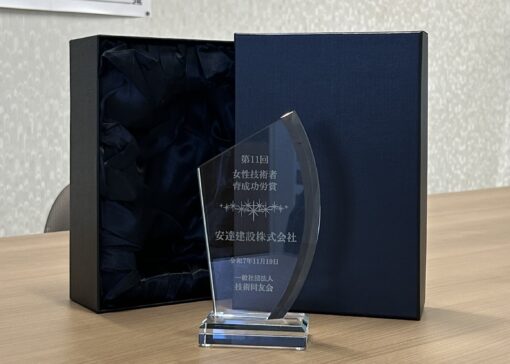 このたび当社は、建設業におけるダイバーシティ推進の取り組みが評価され、女性技術者育成功労賞 組織優秀賞を受賞しました。本賞は、女性が長く安心して働き続けられる環境づくりに尽力し、技術者としての活躍を後押ししている企業に贈られるものです。