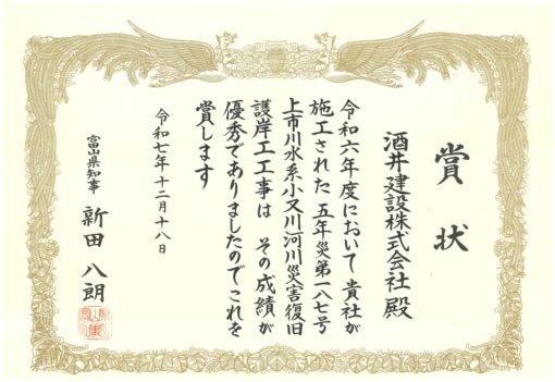 先日、令和7年度富山県建設優良工事(土木部)表彰式が行われ、今回当社が施工した【5年災187号上市川水系小又川河川災害復旧護岸工工事】で知事賞を受賞いたしました✨