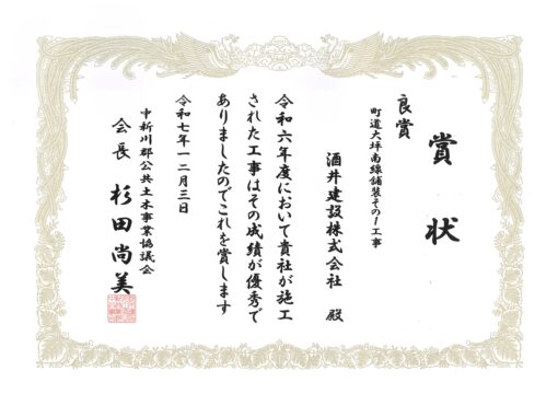さらに、【町道大坪南線舗装その1工事】にて立山土木事務所管内優良土木工事の良賞を受賞いたしました✨
