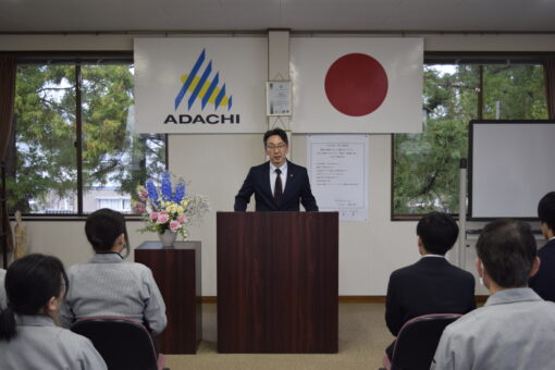 式では、社長より新入社員へ激励の言葉が贈られ、新入社員一人ひとりが社会人としての決意を新たにしました。