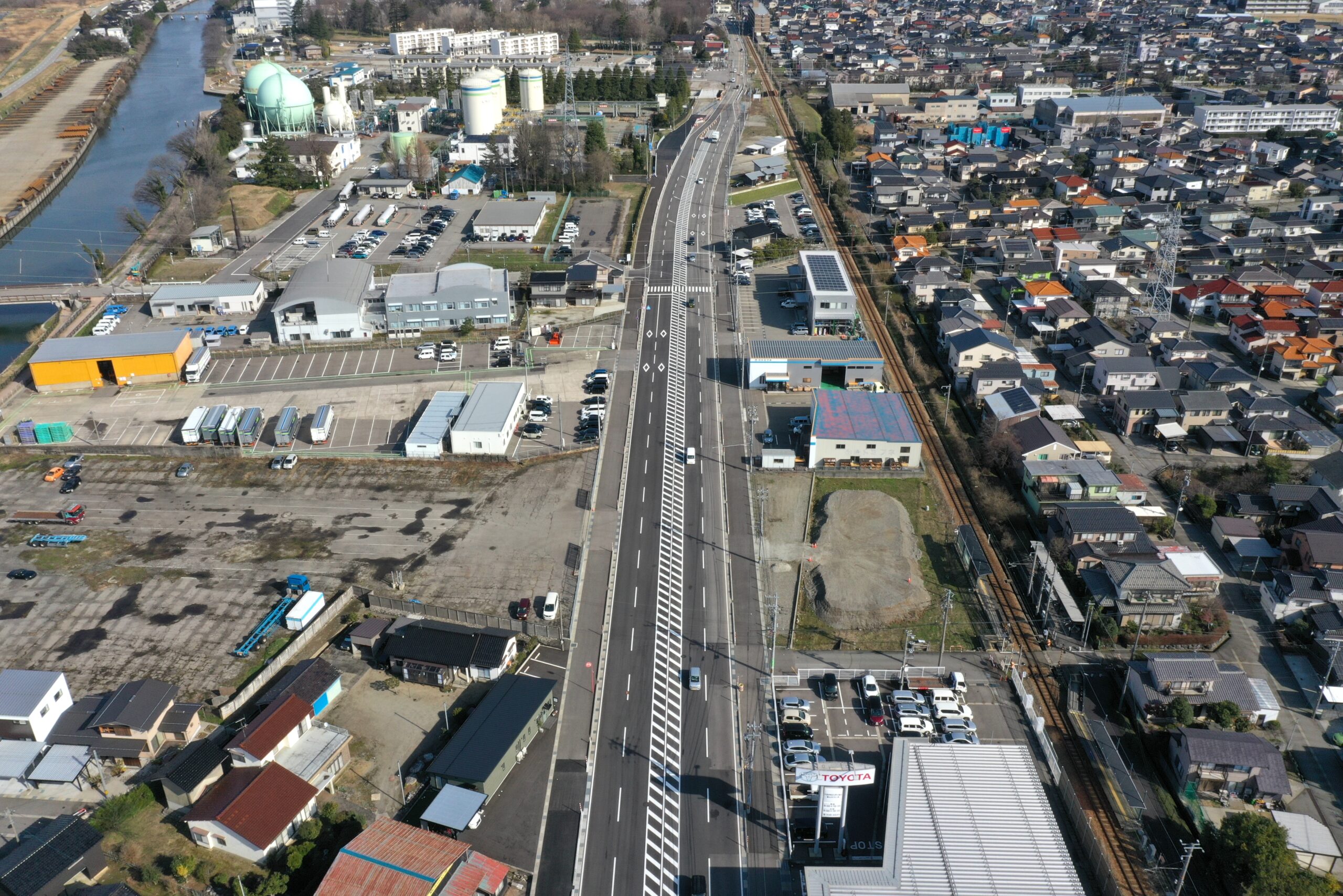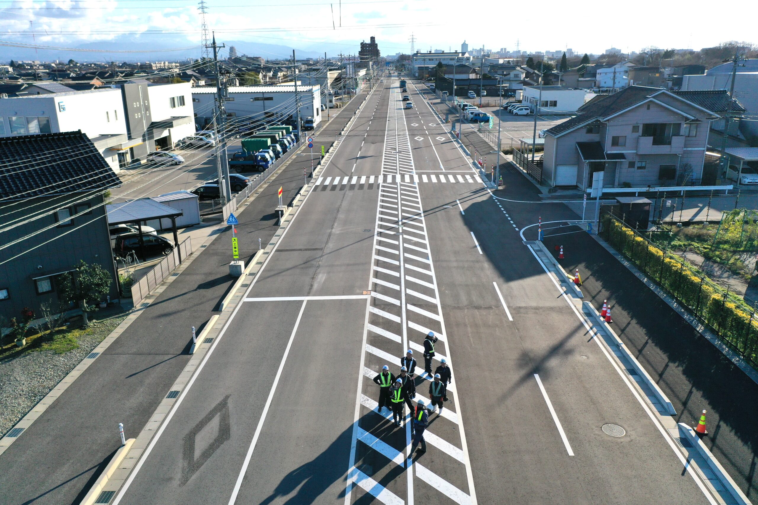 今回の工事(工事名:東岩瀬線道路改築舗装第1工区工事)は、2車線の道路を4車線に広げ、舗装する工事です。富山駅から岩瀬地区につながる県道の拡幅工事は数年がかりの事業で、今回はその集大成となる大きな工事でした。