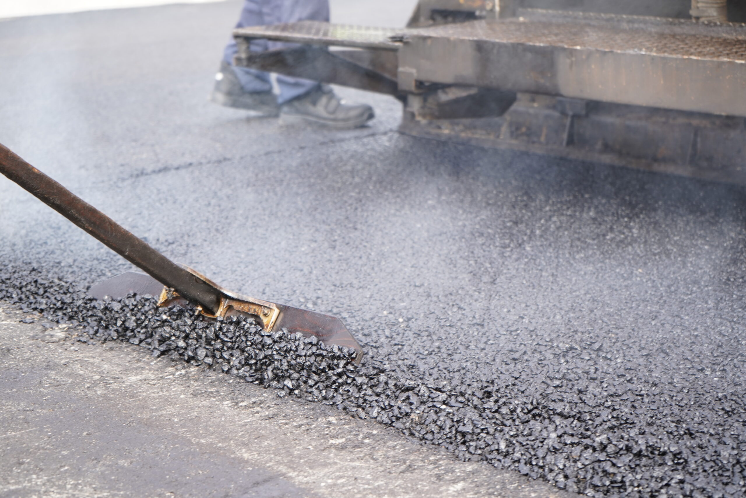 アスファルトを寄せて調整。あっつあつのアスファルトを人の手で丁寧に仕上げます