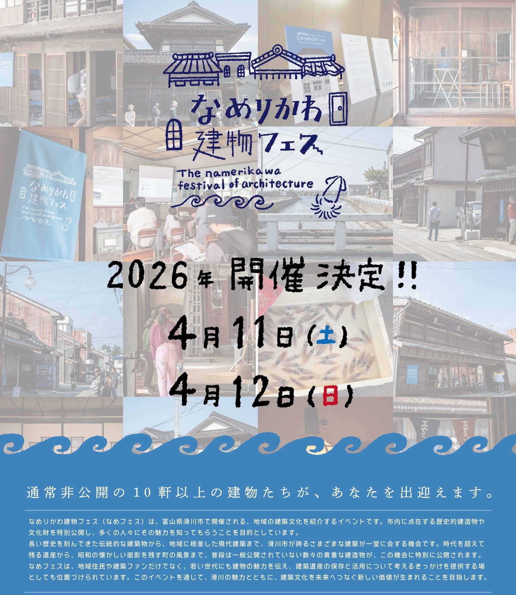 滑川市の魅力を建物を通して伝えるイベント「なめりかわ建物フェス2026(通称:なめフェス)」が、4月11日(土)・12日(日)に開催されます!昨年初開催したイベントで今年で2年目です。